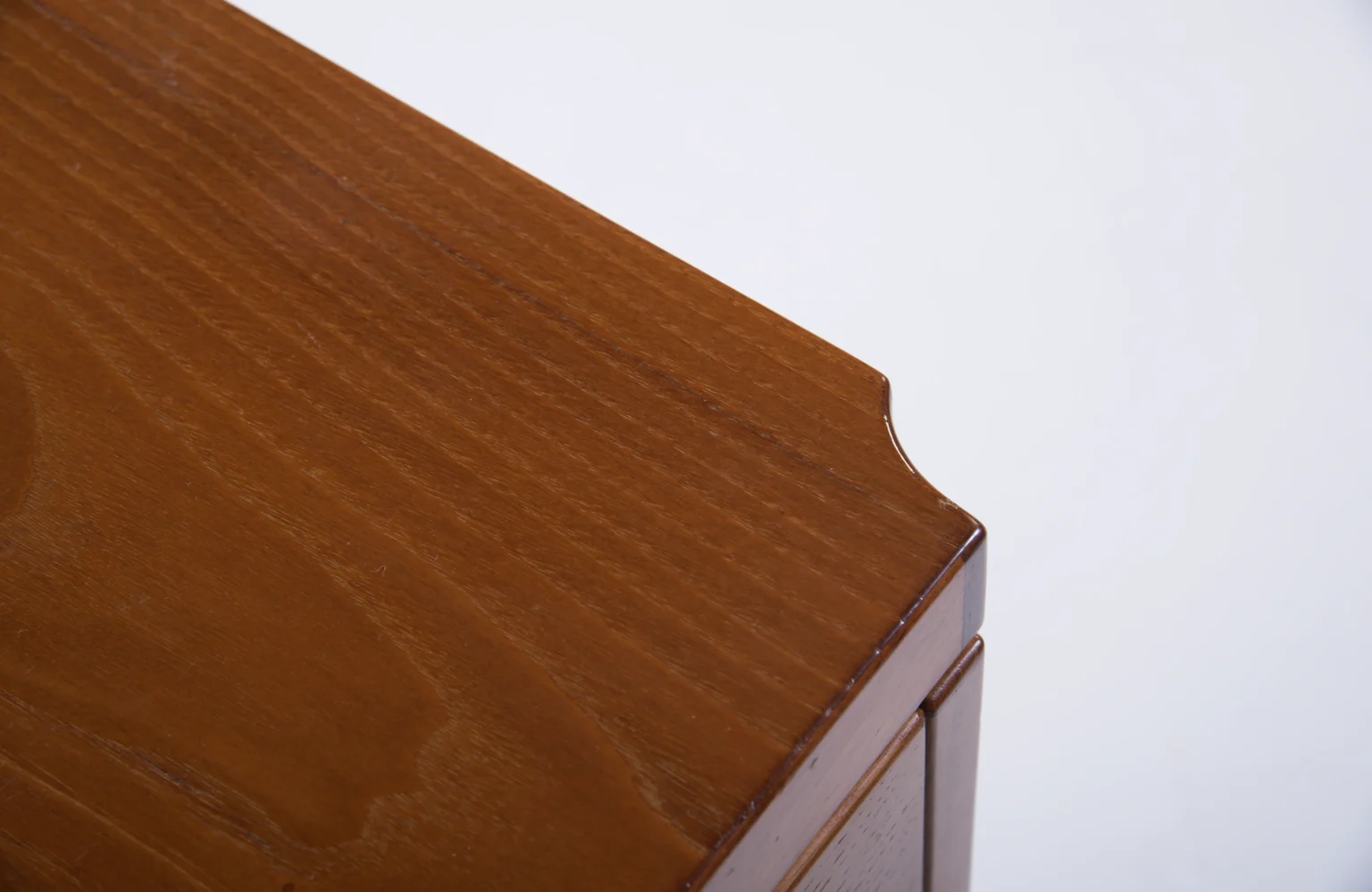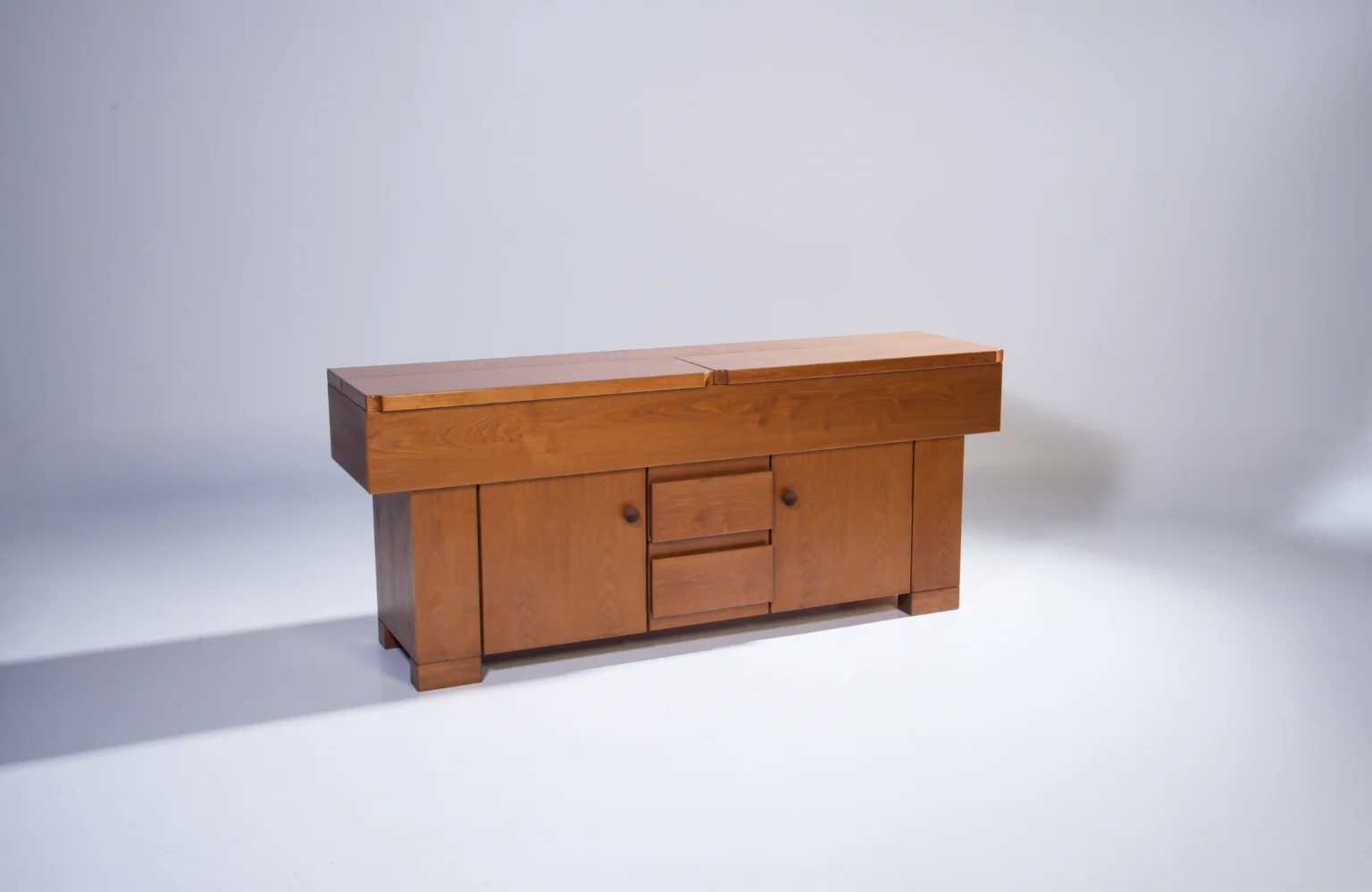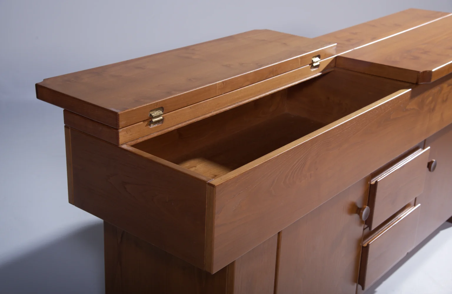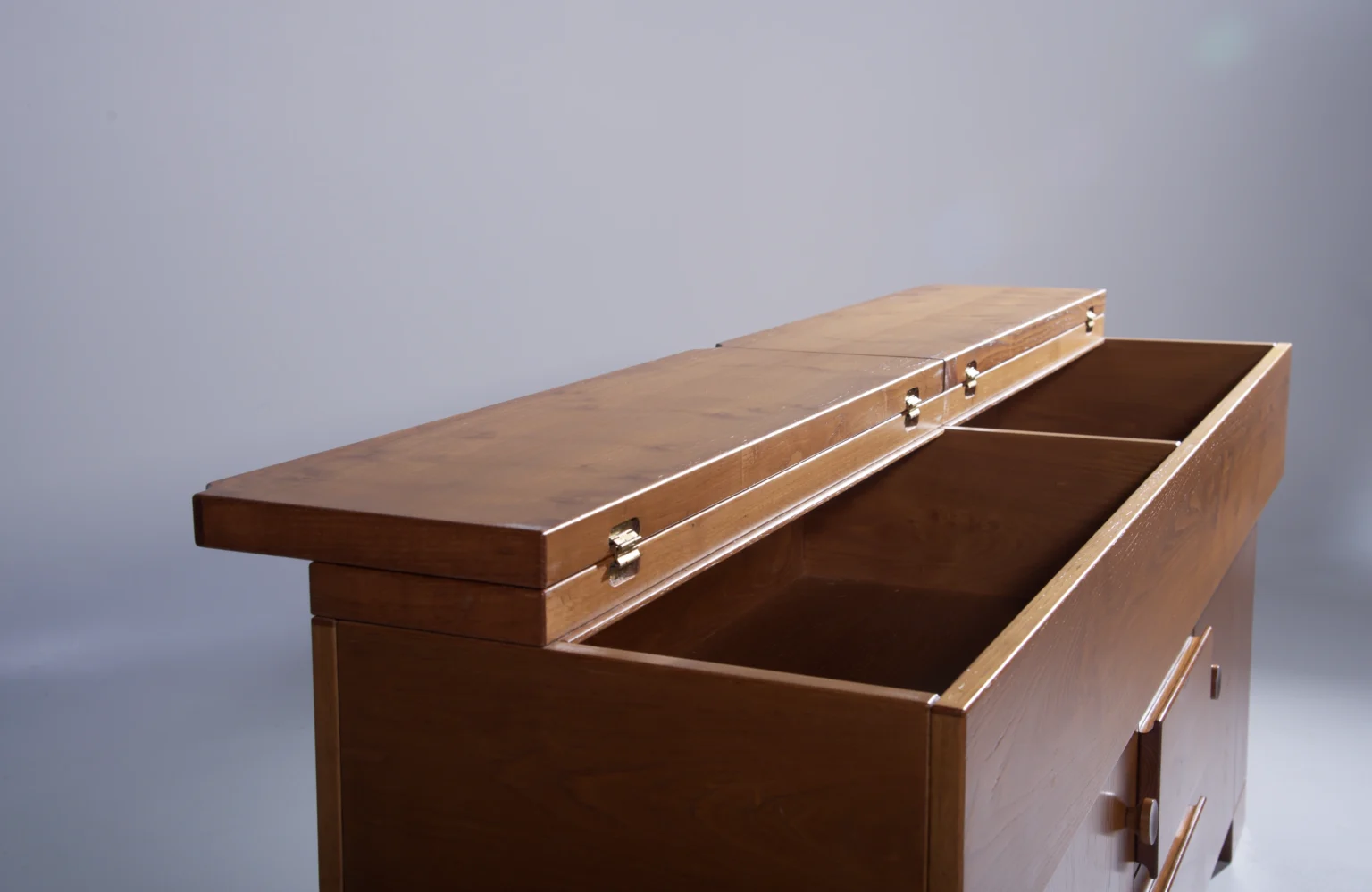 The cabinet is made in elegant walnut (walnut veneer) and offers a practical layout with doors, drawers, and a characteristic top section that opens to reveal additional storage.