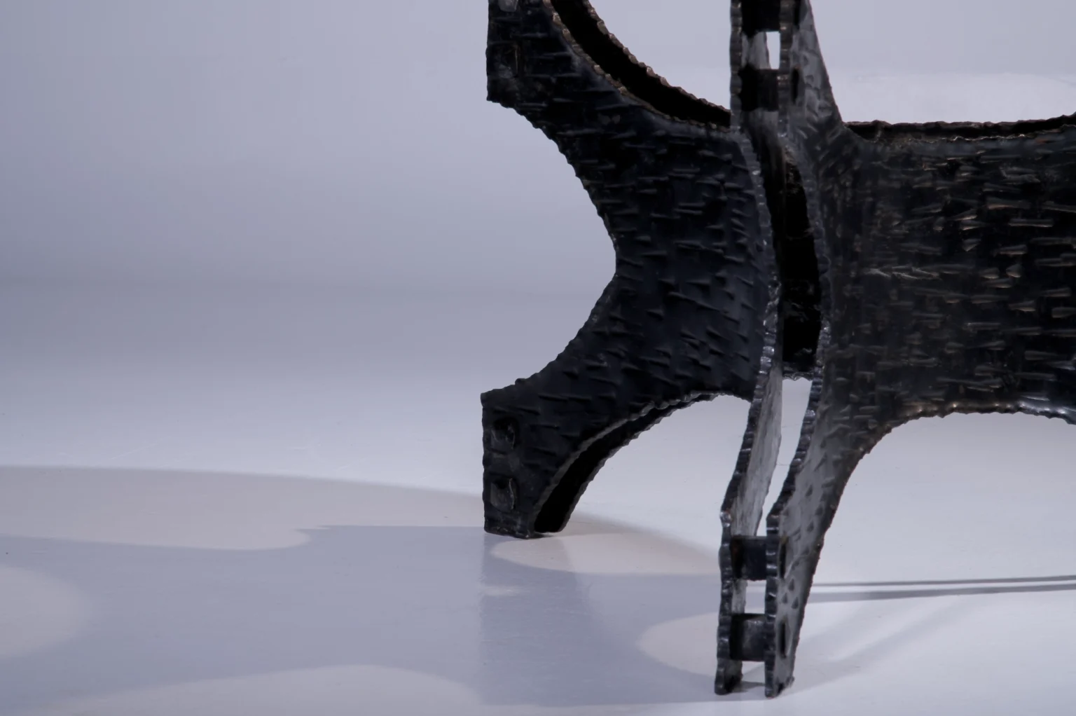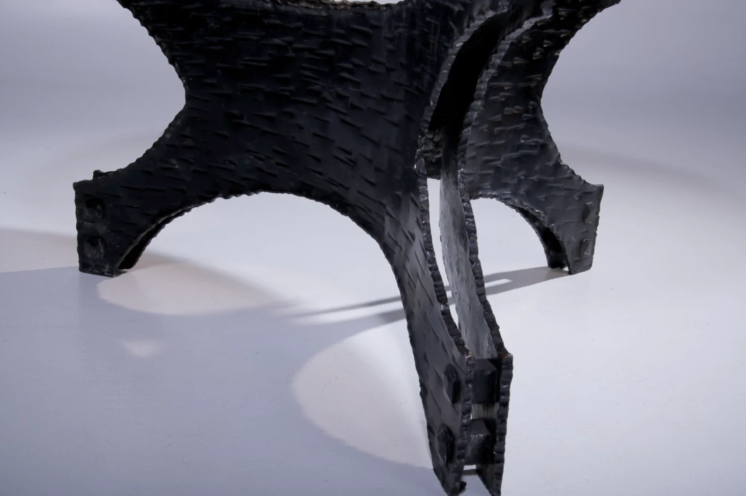 Brutalist coffee table with a cast aluminum base and smoked glass top is a unique piece of furniture. The rough casted frame contrasts with the elegant smoked glass, giving the table both robustness and refinement. This table is a timeless statement piece that emphasizes craftsmanship and durability and seamlessly fits into various interior styles.
